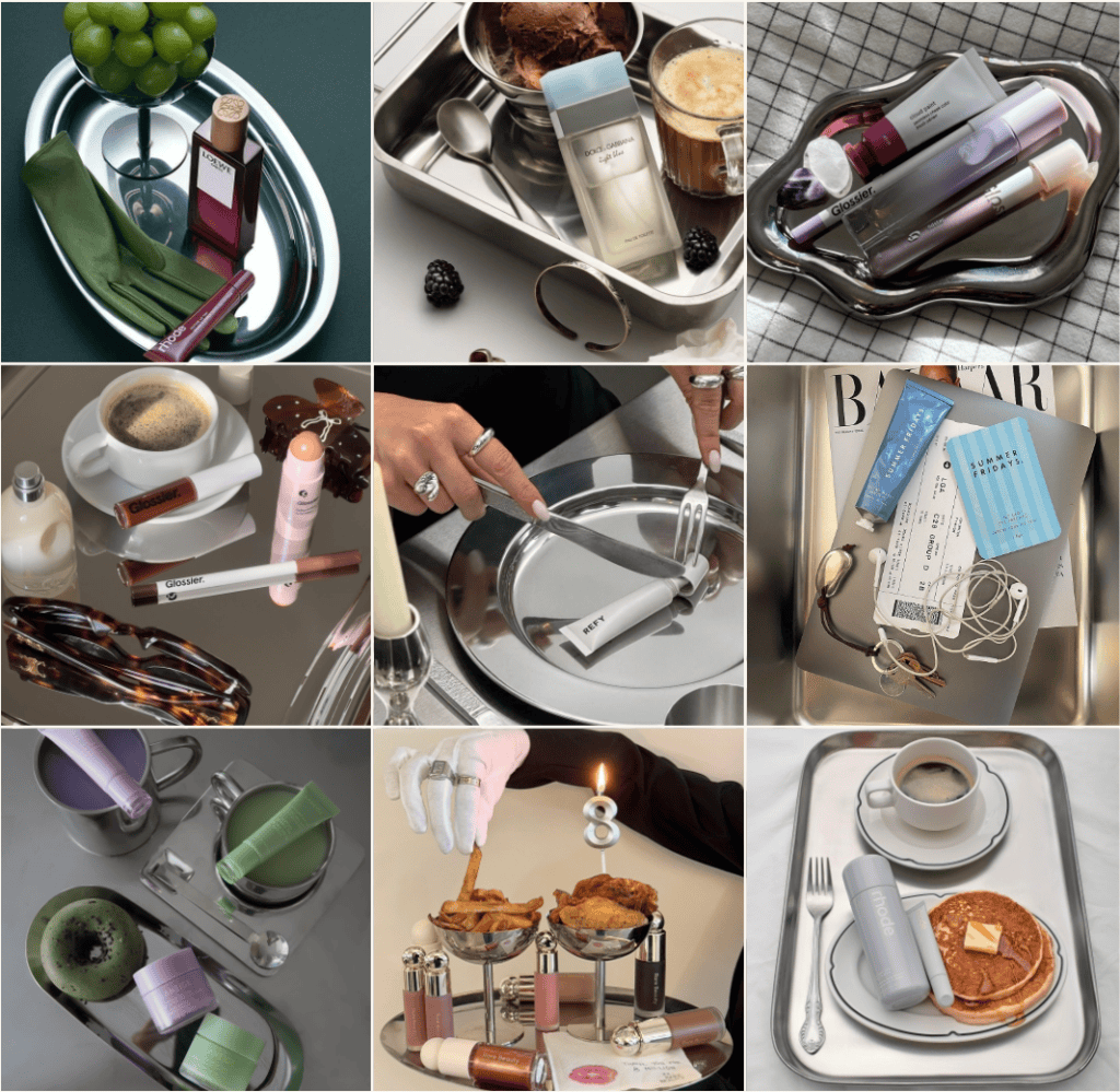 Vintage trays and reflective surfaces are making a comeback. Silverware styling elevates product flatlays, turning them into editorial-level content with a touch of sophistication and indulgence.